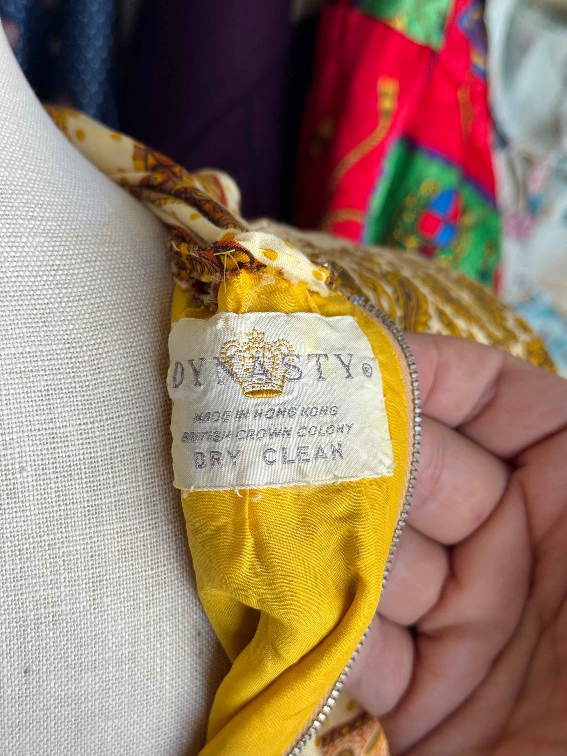 This 1960s vintage dress by Dynasty, made in Hong Kong, is a timeless piece with a classic silhouette and charming details. It features a functional metal zipper and a versatile neck tie that can be styled multiple ways — wear it loose for a relaxed look or tied for a more polished, feminine feel. The shorter length gives it that perfect mod-era vibe, making it an easy go-to for both casual and dressed-up vintage styling.