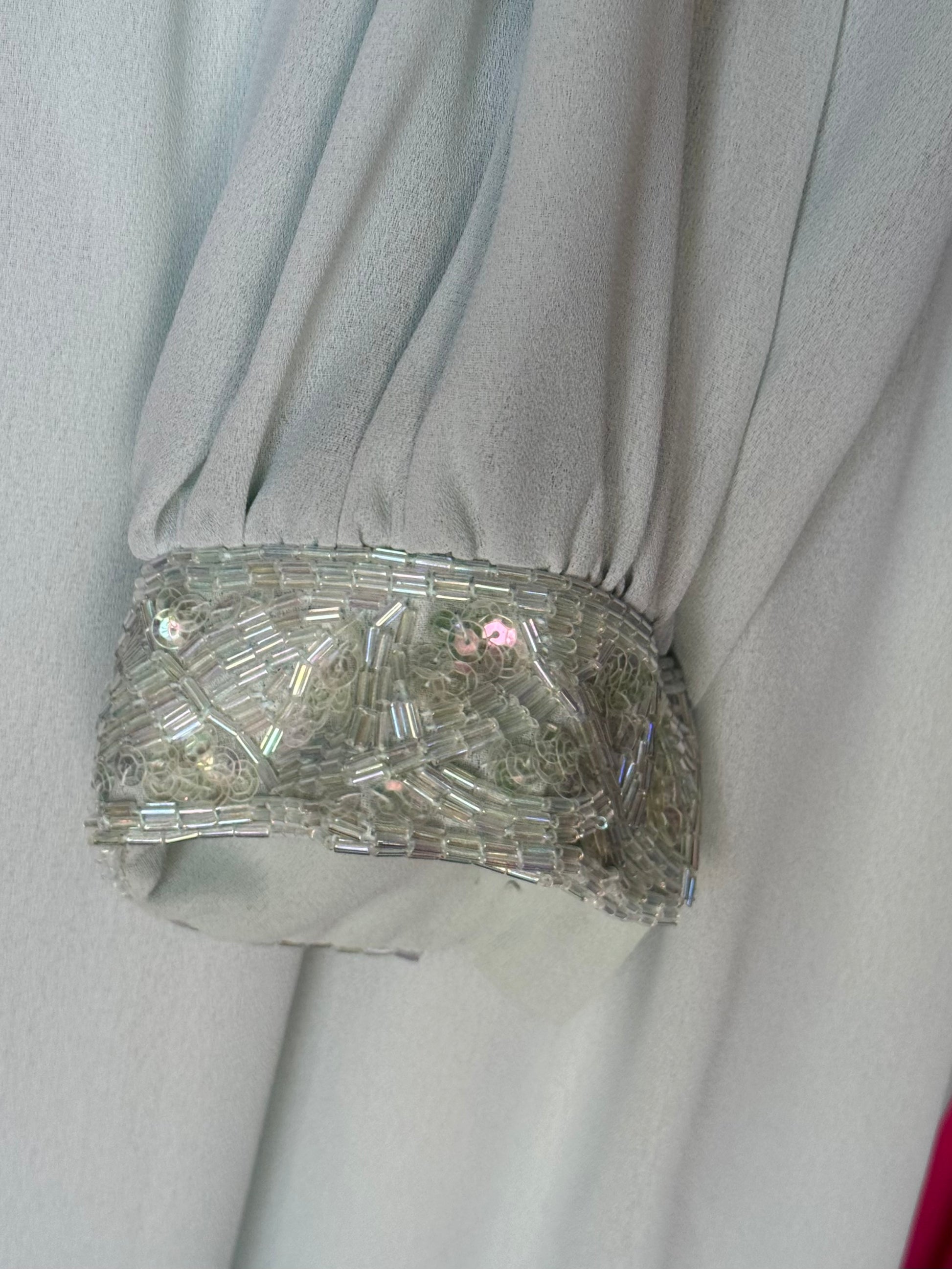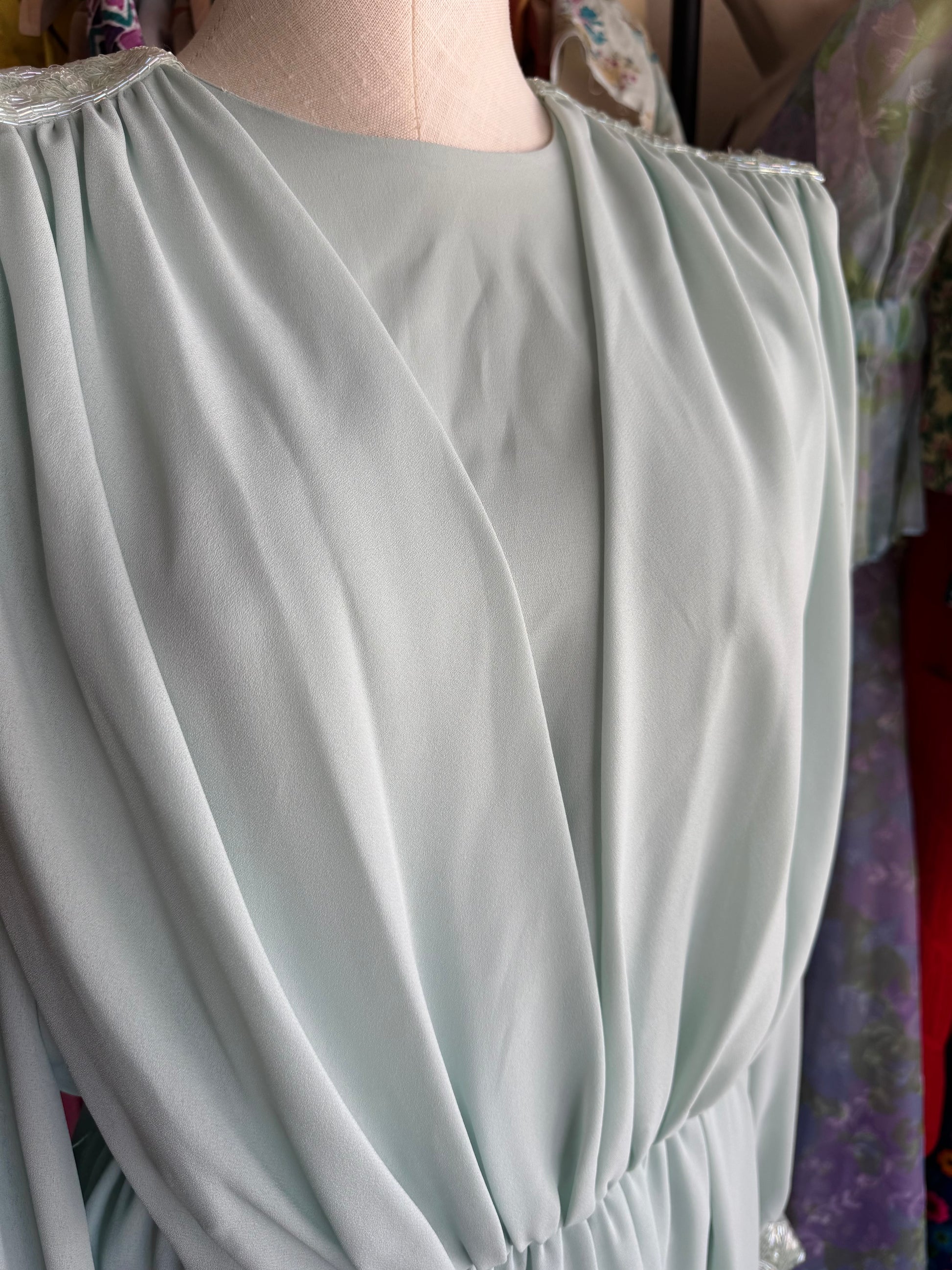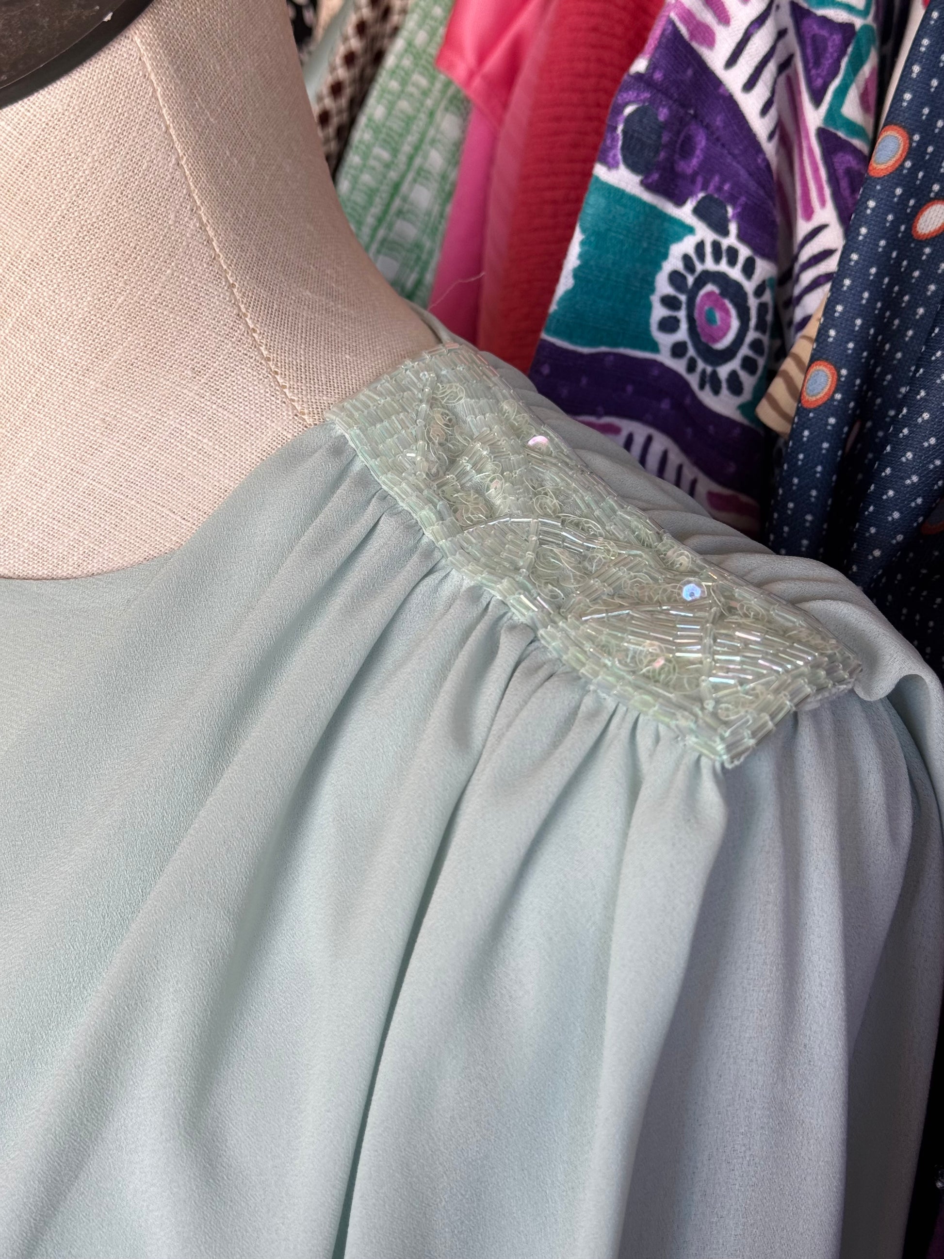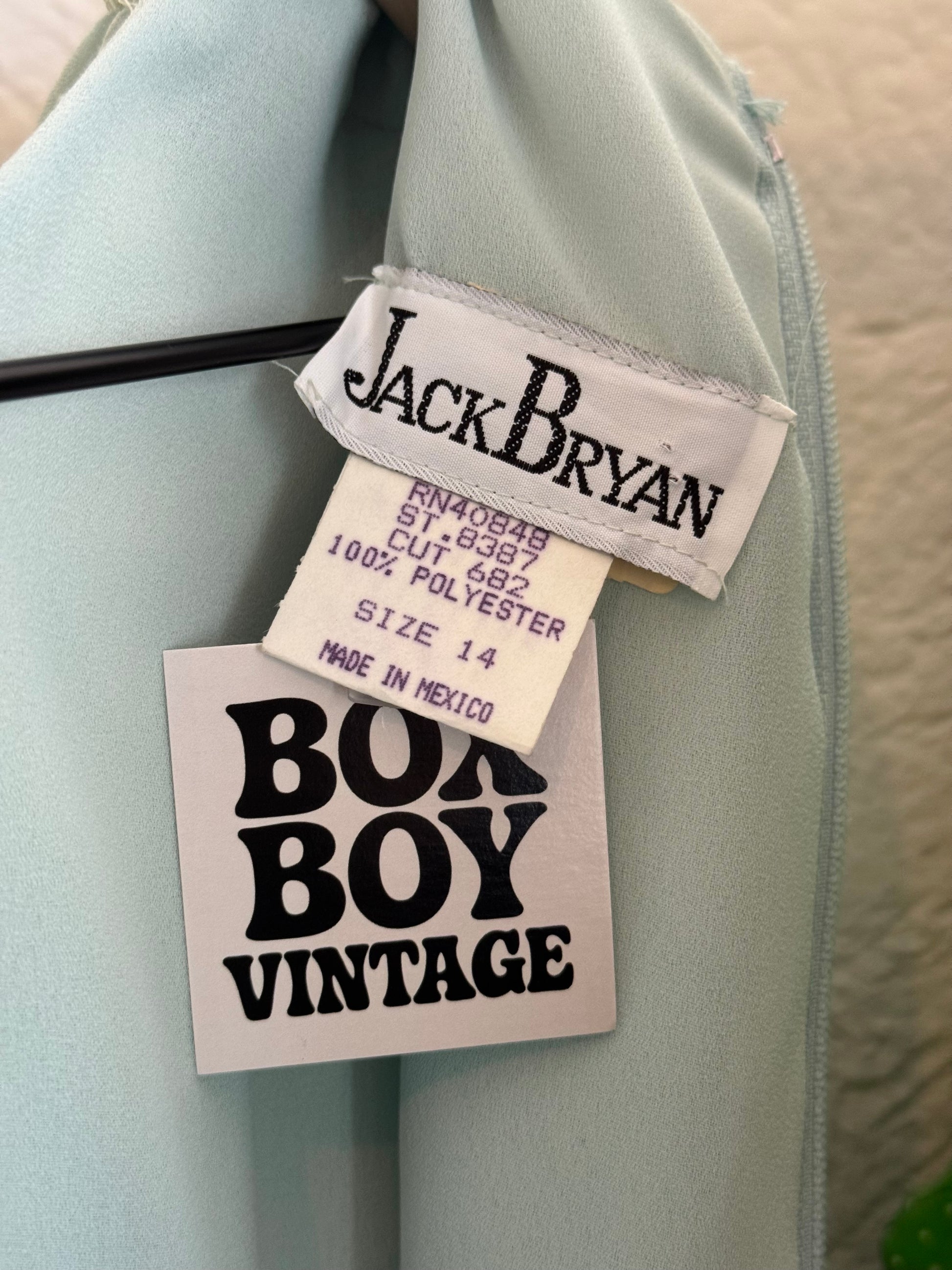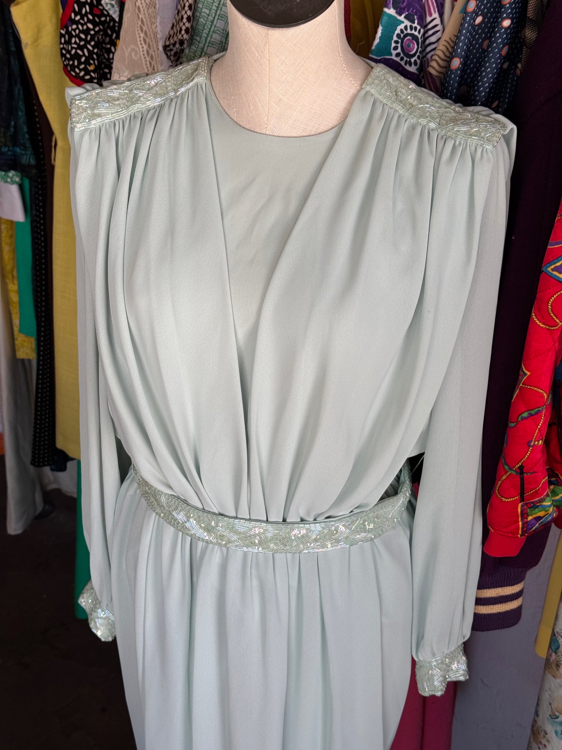 This 1980s vintage dress by Jack Bryan is a stunning, elegant piece in a soft pale blue tone, featuring delicate bead detailing along the shoulders, sleeves, and matching belt. The design has that classic elevated eveningwear feel, with a flowing full-length silhouette and subtle sparkle that catches the light beautifully. The elastic waist allows for a comfortable yet flattering fit, making this a standout formal or special occasion piece with timeless vintage charm.